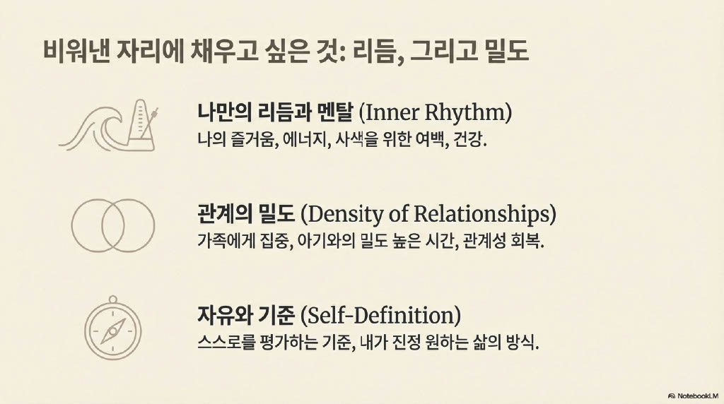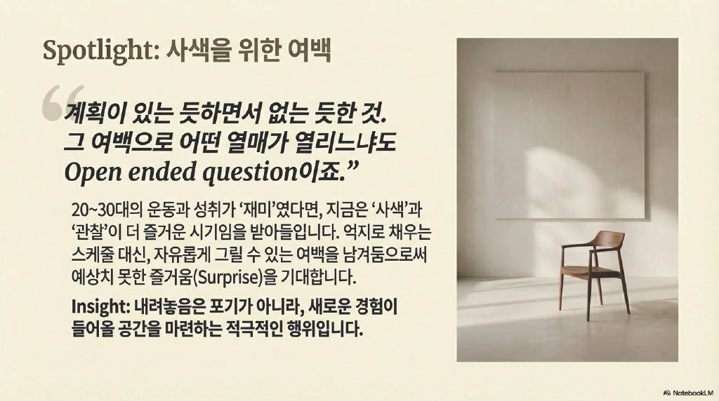 여기서 말하는 여백은 아무 계획도 없는 상태가 아닙니다. 모든 시간을 루틴과 의무로 채워야 제대로 살고 있는 것 같다는 생각에서 한 발 물러나는 태도에 가깝습니다. 여백이 있어야 생각이 이어지고, 그래야 깊이가 생깁니다.