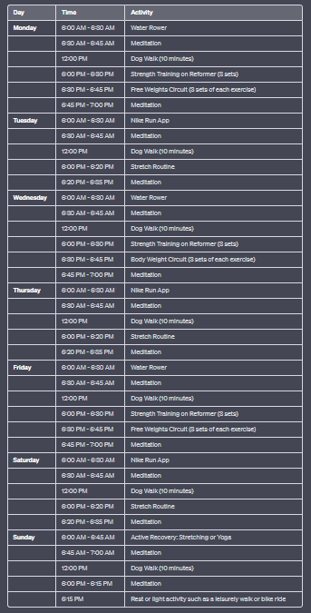 ํ์์ผ, ๋ชฉ์์ผ, ํ ์์ผ์๋ ์์นจ์ ๋์ดํค ๋ฐ ์ฑ์ ์ด์ฉํ์ฌ 20-30๋ถ ๋์ ๋ฌ๋ฆฌ๊ธฐ ์ด๋์ ํ๊ณ , ์ ๋ ์๋ 15-20๋ถ ๋์ ์คํธ๋ ์นญ ๋ฃจํดํ๋ค.
